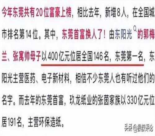 其中,东莞首富换人了!由东阳光的郭梅兰、张寓帅母子以400亿元位居全国146名,东莞第一名。