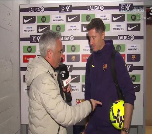西甲第13轮,巴塞罗那主场4-0大胜毕尔巴鄂竞技,赛后,巴萨前锋莱万多夫斯基接受了媒体采访。我们看到你手持这个